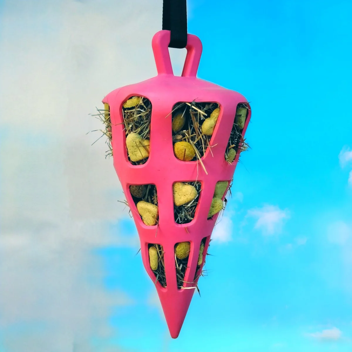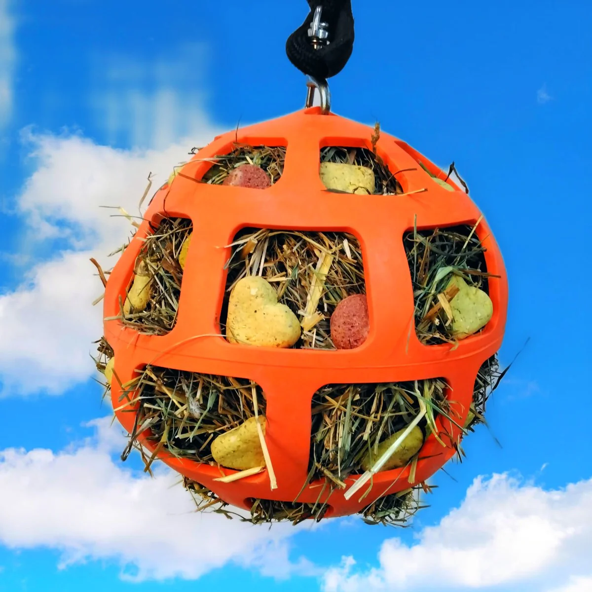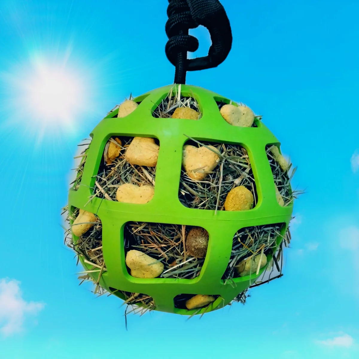 Der Hay Slow Feeder ist für den Einsatz im Anhänger, im Stall oder auf der Weide geeignet. Füllen Sie den Ball mit Karotten, Kräutern, Stroh, Gras oder Apfelstückchen! Dies bietet stundenlangen Spielspaß für Ihr Pferd!